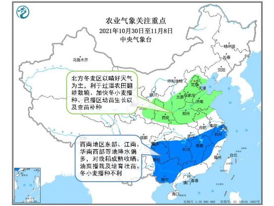 預計未來10天,北方冬麥區(qū)以晴好天氣為主,利于過濕農田翻耕散墑,墑情將進一步改善,利于加快冬小麥播種進度以及已播區(qū)查苗補種。西南地區(qū)東部、江淮東部、江漢西部、江南、華南等地多陰雨天氣,部分地區(qū)雨日可達5~8天,降水量有50~80毫米、局部超過100毫米,較常年明顯偏多,對晚稻成熟收曬、油菜播栽及培育壯苗、冬小麥播種不利。11月4日起,受冷空氣影響,新疆北部、西北地區(qū)東部、華北北部及東北等地的部分地區(qū)有小到中雪(雨)或雨夾雪,局地有大雪或暴雪,對設施農業(yè)和畜牧業(yè)生產(chǎn)不利。