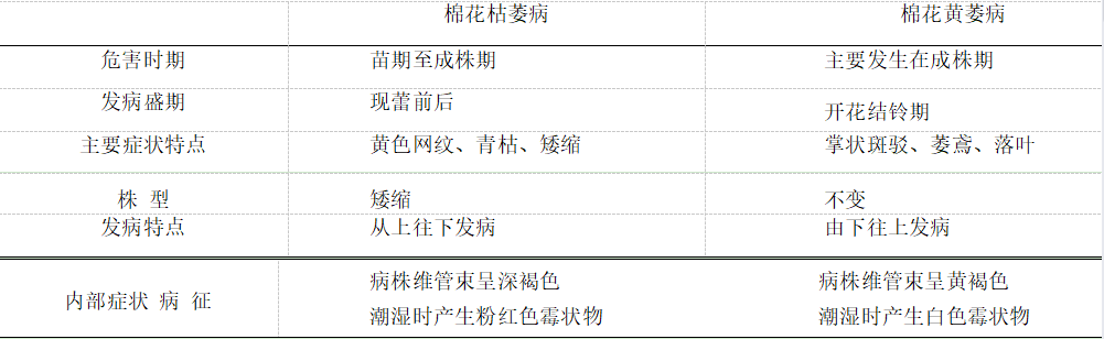 表 棉花枯萎病和棉花黃萎病癥狀比較