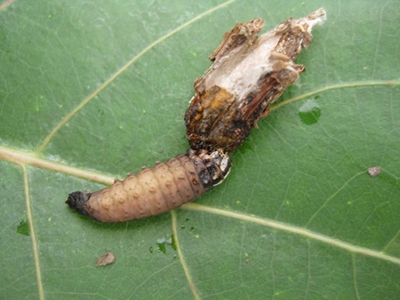 幼蟲共6?7齡。卵多于14:00-15:00孵化。孵化后幼蟲先在囊內(nèi)咬食卵殼,1?2d后自母囊排泄孔爬出,腹部豎起迅速爬至枝葉,或吐絲下垂隨風(fēng)飄散到附近茶叢上,片刻后即開始吐絲和咬取枝葉碎屑營(yíng)囊護(hù)身,護(hù)囊歷經(jīng)1.5?2. 0h建成,而后開始取食。隨著蟲齡增大護(hù)囊也隨之增大。幼蟲活動(dòng)、取食時(shí),僅頭、胸伸出,用胸足爬行負(fù)囊行進(jìn)。初孵時(shí)護(hù)囊能隨腹部向上豎立,狀如鉚釘,稍大后即腹部下垂,懸掛于枝葉下面。幼蟲取食多在清晨、傍晚和陰天。晴天中午很少取食,常隱藏在茶叢中葉背。幼齡幼蟲取食下表皮和葉肉,留上表皮呈半透明黃褐色斑膜;三齡后咬食葉片成孔洞;四齡后食量大增,能咬食全葉、嫩梢和果皮,并咬取小枝,整齊并列黏綴于囊處。每頭幼蟲食葉量幼齡時(shí)為0.25g,老熟前為24g。幼蟲老熟時(shí)先吐絲封閉囊口,將上端用絲緊附于枝葉上,后將蟲體上下倒轉(zhuǎn),化蛹于囊內(nèi)。