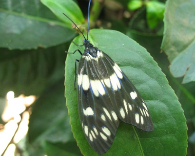 成蟲:體長為18?22mm,翅展為55?67mm,頭、胸部及腹基藍黑色,腹部第三節(jié)后背面黃色,腹面黑色。前后翅均藍黑色,并帶有光澤,前翅有3列后翅有2列黃白色斑,連成黃白色橫帶。